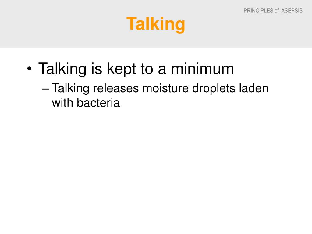 Talking • Talking is kept to a minimum • Talking releases moisture droplets laden with bacteria