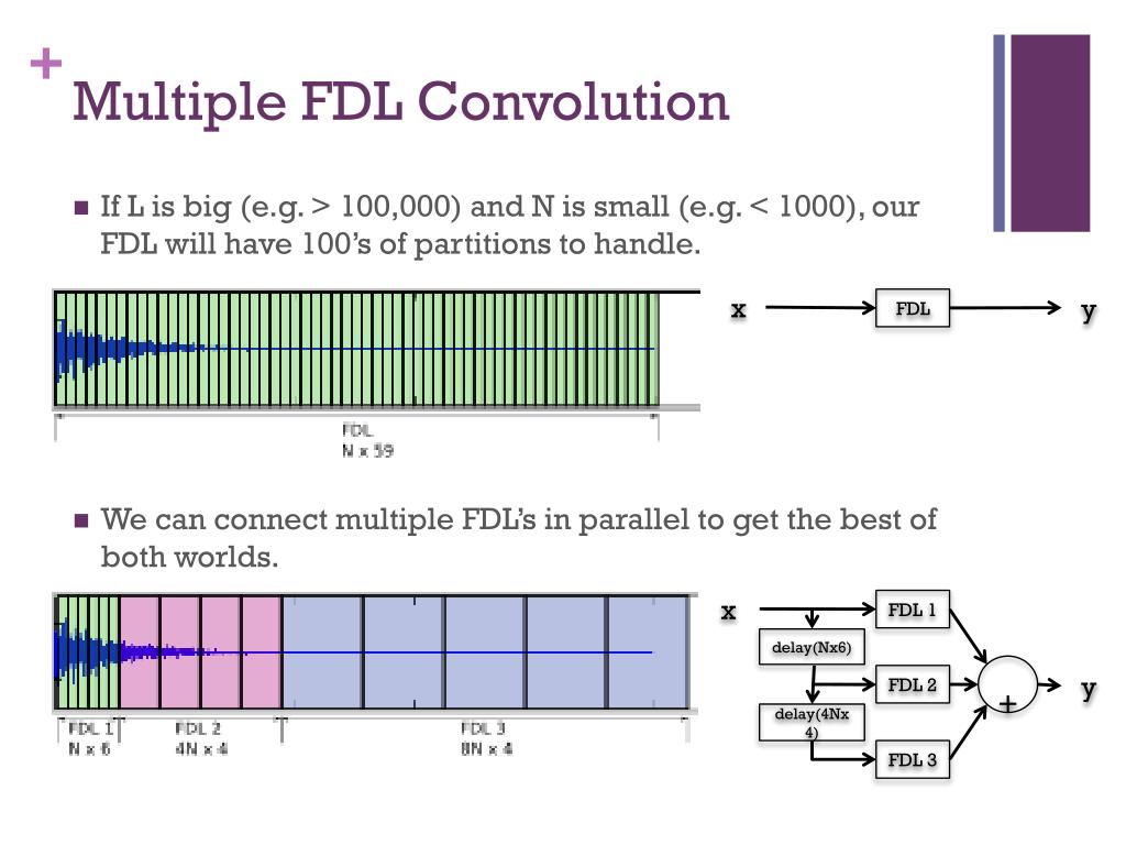 Multiple FDL Convolution • If L is big (e.g. > 100,000) and N is small (e.g. < 1000), our FDL will have 100’s of partitions to handle. • We can connect multiple FDL’s in parallel to get the best of both worlds. x FDL y x FDL 1 delay(Nx6) + FDL 2 y delay(4Nx4) FDL 3