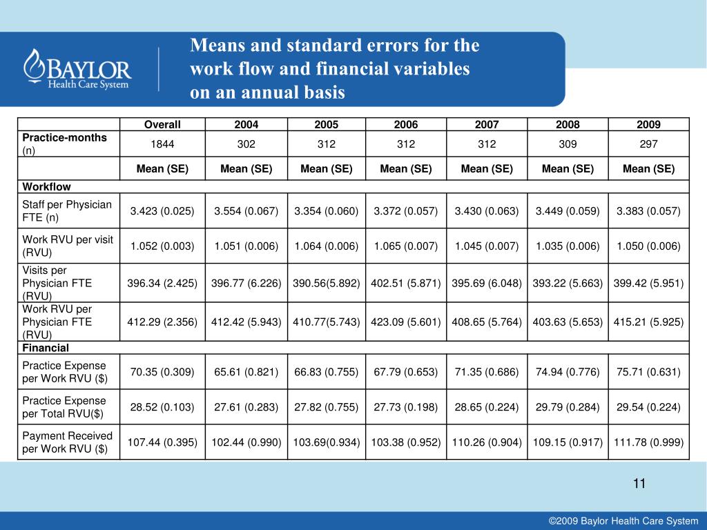 Study Data • Data related to individual patient visits and revenues were collected from the network billing and collection administrative system • Charges were captured at the procedure code level, and linked to the RVU values, obtained from Ingenix • A single year’s RVU scale (2009) was used for all years to make cross-year comparisons on a standardized basis • Specific practice costs and non- physician staffing data, in conjunction with physician staffing data were also captured to compute the measures examined