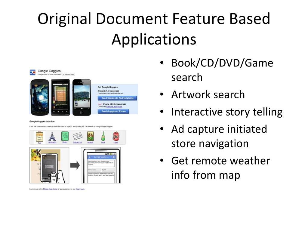 Original Document Feature Based Applications • Book/CD/DVD/Game search • Artwork search • Interactive story telling • Ad capture initiated store navigation • Get remote weather info from map