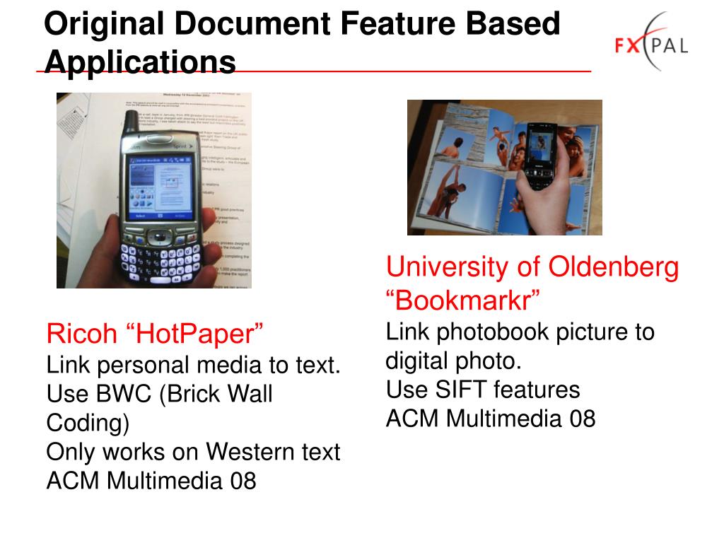 Original Document Feature Based Applications University of Oldenberg “Bookmarkr” Link photobook picture to digital photo. Use SIFT features ACM Multimedia 08 Ricoh “HotPaper” Link personal media to text. Use BWC (Brick Wall Coding) Only works on Western text ACM Multimedia 08