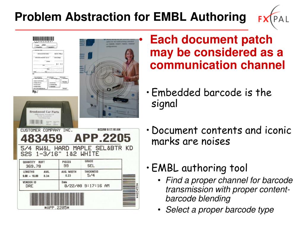 Problem Abstraction for EMBL Authoring • Each document patch may be considered as a communication channel • Embedded barcode is the signal • Document contents and iconic marks are noises • EMBL authoring tool • Find a proper channel for barcode transmission with proper content-barcode blending • Select a proper barcode type