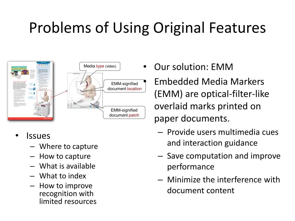 Problems of Using Original Features • Issues • Where to capture • How to capture • What is available • What to index • How to improve recognition with limited resources • Our solution: EMM • Embedded Media Markers (EMM) are optical-filter-like overlaid marks printed on paper documents. • Provide users multimedia cues and interaction guidance • Save computation and improve performance • Minimize the interference with document content