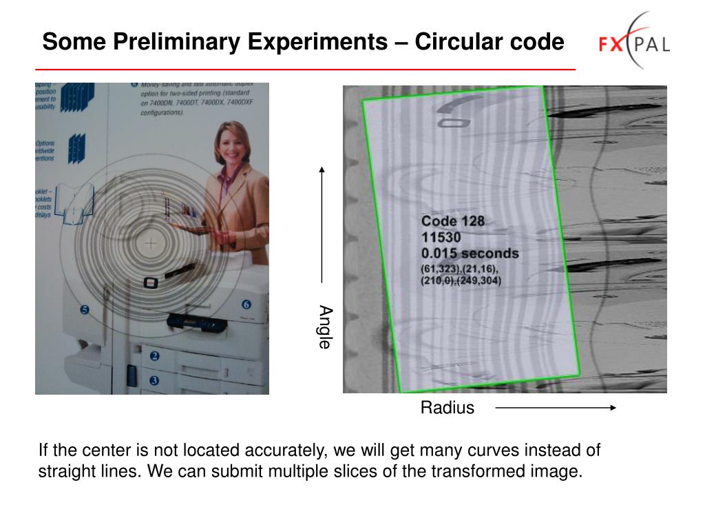 Some Preliminary Experiments – Circular code Angle Radius If the center is not located accurately, we will get many curves instead of straight lines. We can submit multiple slices of the transformed image.