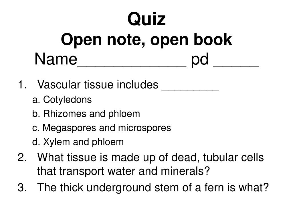 QuizOpen note, open bookName____________ pd _____ • Vascular tissue includes _________ a. Cotyledons b. Rhizomes and phloem c. Megaspores and microspores d. Xylem and phloem • What tissue is made up of dead, tubular cells that transport water and minerals? • The thick underground stem of a fern is what?