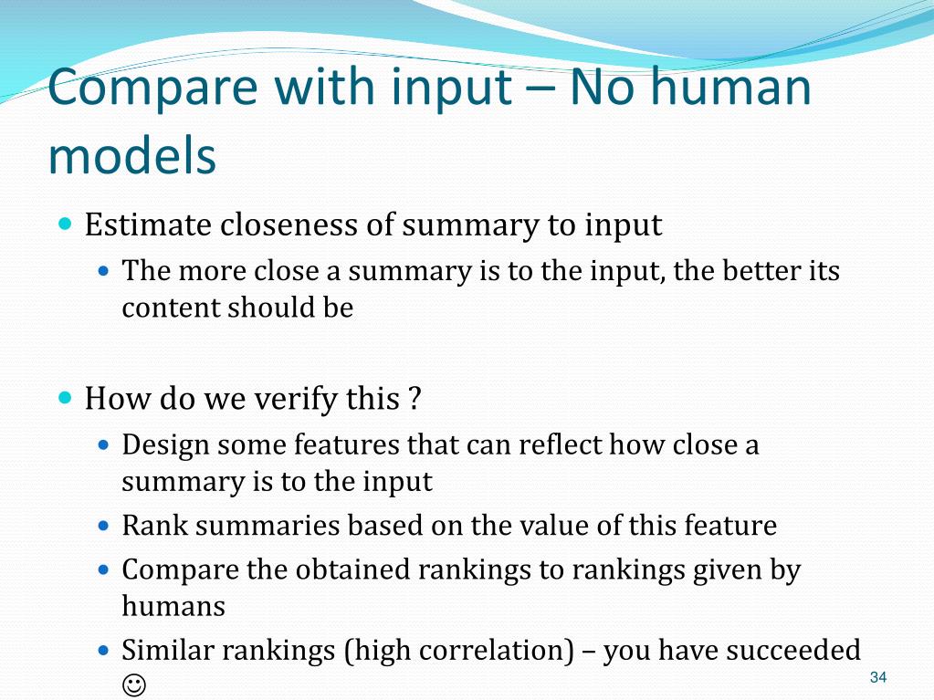 Compare with input – No human models Estimate closeness of summary to input The more close a summary is to the input, the better its content should be How do we verify this ? Design some features that can reflect how close a summary is to the input Rank summaries based on the value of this feature Compare the obtained rankings to rankings given by humans Similar rankings (high correlation) – you have succeeded