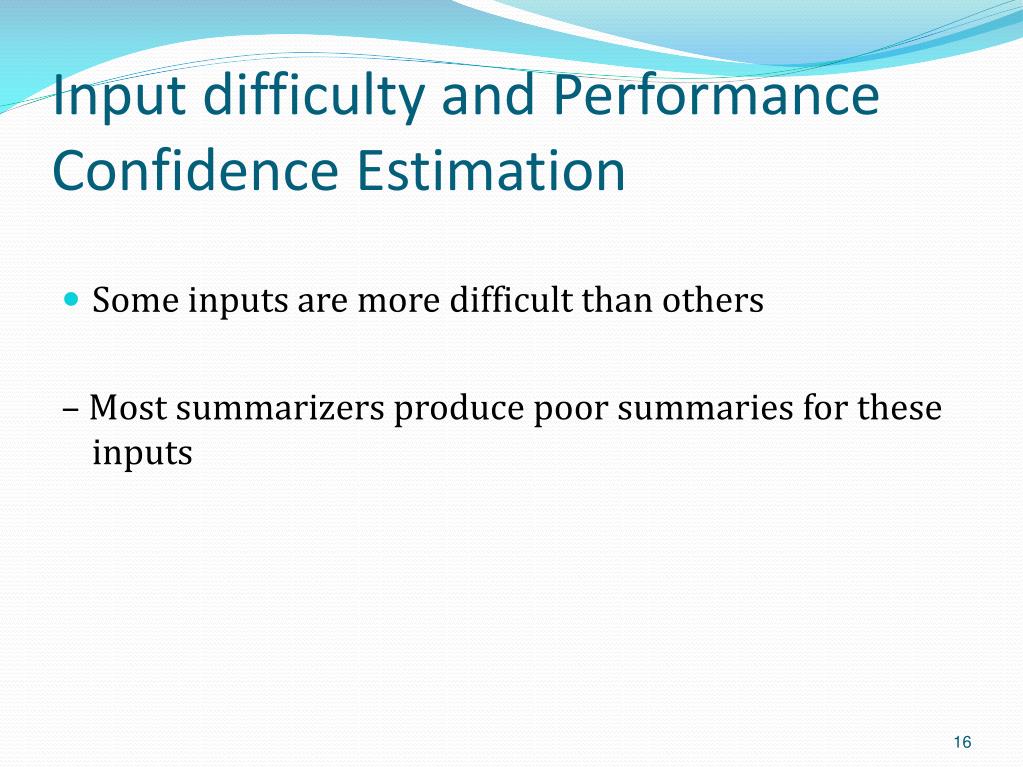 Input difficulty and Performance Confidence Estimation Some inputs are more difficult than others – Most summarizers produce poor summaries for these inputs