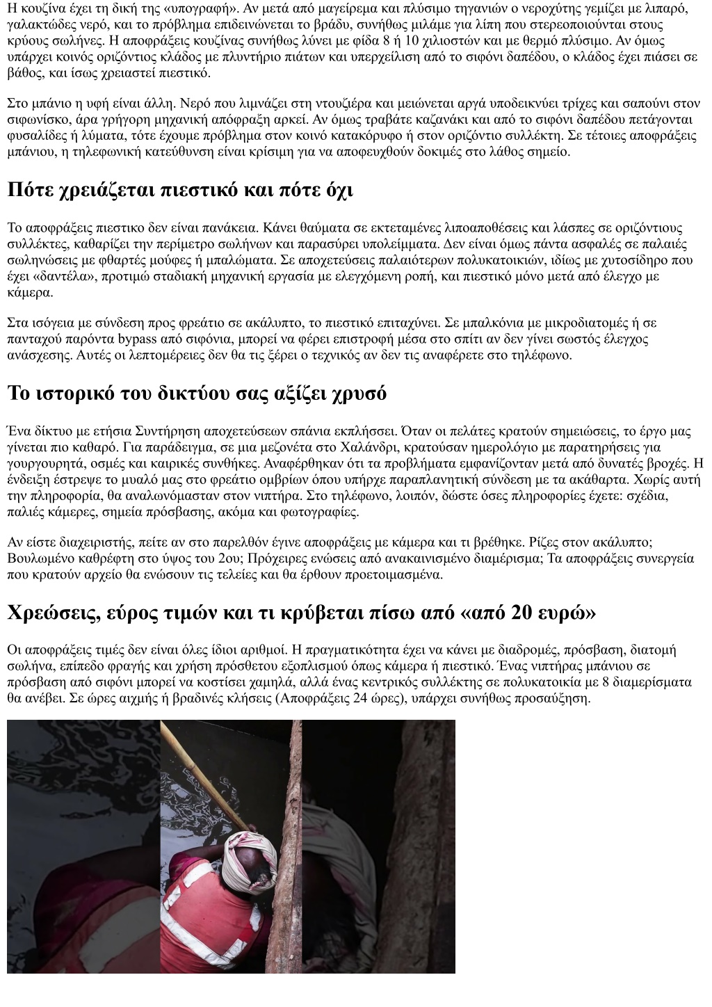 Όταν ζητάτε αποφράξεις τιμοκατάλογος, ρωτήστε αν περιλαμβάνει ΦΠΑ, αν υπάρχει χρέωση διάγνωσης όταν δεν γίνει εργασία, αν η χρήση κάμερας τιμολογείται ξεχωριστά, και αν γίνεται εγγύηση για συγκεκριμένο χρονικό διάστημα. Προσωπικά, αποφεύγω «τηλέφωνο-τιμή» χωρίς καμία πληροφορία. Δώστε τα συμπτώματά σας και ζητήστε ένα εύρος. Αν κάποιος υπόσχεται λύση σε τιμή «ό,τι και να είναι», προσέξτε. Τα σοβαρά αποφράξεις εταιρείες ξεκαθαρίζουν τι καλύπτει η τιμή και τι όχι. Ποιους όρους να γνωρίζετε για να μιλάτε την ίδια γλώσσα Δεν χρειάζεστε τεχνικό λεξικό, λίγες λέξεις όμως βοηθούν. Σιφόνι δαπέδου είναι το καπάκι στο μπάνιο που συγκρατεί οσμές. Στήλη είναι ο κατακόρυφος αγωγός του κτιρίου, συλλέκτης ο οριζόντιος που οδηγεί προς φρεάτιο. Καθρέφτης λέμε την επίπεδη οριζόντια διαδρομή αγωγού όπου λιμνάζει νερό. Αν έχετε φρεάτιο ελέγχου στην αυλή, πείτε αν το νερό είναι σε ύψος, αν κινείται, αν έχει λίπη σαν γάλα ή αν έχει ρίζες. Η λέξη apofraxeis χρησιμοποιείται συχνά για να βρεθούν υπηρεσίες online. Όταν ρωτάτε «αποφράξεις κοντά», δώστε περιοχή ή σταυροδρόμια. Ο χρόνος πρόσβασης συχνά καθορίζει τη διαθεσιμότητα σε έκτακτες βάρδιες. Τι να κάνετε πριν φτάσει ο τεχνικός Μικρές κινήσεις γλιτώνουν ζημιές. Κλείστε την παροχή νερού αν υπάρχει υπερχείλιση από σιφόνια ή καζανάκια. Μην χρησιμοποιείτε καθόλου τις αποχετεύσεις που επικοινωνούν με το προβληματικό δίκτυο. Αν μπορείτε, ανοίξτε ένα καπάκι φρεατίου στον ακάλυπτο για να ανακουφιστεί η στήλη από πίεση. Κρατήστε μακριά χαλάκια, ντουλάπια κάτω από νεροχύτες και εκτεθειμένα αντικείμενα. Αν έχετε κατοικίδια, περιορίστε τα, για να αποφευχθούν ατυχήματα με καλώδια ή εξοπλισμό. Μην ρίχνετε χημικά καθαριστικά λίγο πριν το ραντεβού. Το υγρό που παραμένει στον σωλήνα επιτίθεται στα εργαλεία, και θα επιβαρύνει την ατμόσφαιρα στον χώρο. Σε πολλές περιπτώσεις, πηχτές γέλες σκληραίνουν και κάνουν τη δουλειά πιο δύσκολη. Επίσης, μην χρησιμοποιείτε συνεχώς το έμβολο σε κουζίνα γεμάτη λίπη, γιατί απλώς θα στείλετε το πρόβλημα βαθύτερα στον συλλέκτη. Τι ρωτούν συνήθως οι τεχνικοί στο τηλέφωνο και γιατί Θα ακούσετε ερωτήσεις όπως: «Υπάρχει υπερχείλιση ή απλώς αργή ροή;» Το κριτήριο είναι το επίπεδο κινδύνου. «Ακούγονται γουργουρητά σε άλλα σημεία;» Αναζητούνται ενδείξεις για στήλη. «Υπάρχει φρεάτιο στην αυλή;» Σημασία στην πρόσβαση και στη δυνατότητα πλύσης. «Έχει γίνει ποτέ έλεγχος με κάμερα;» Αν ναι, μπορεί να υπάρχει μικρομετατόπιση ή καθίζηση. «Πόσα διαμερίσματα είναι στην στήλη;» Το φορτίο απορροών αλλάζει την επιλογή εργαλείου. Στις περιπτώσεις με υπόγεια, η ερώτηση για antliseis είναι κρίσιμη. Αν οι αντλίες λειτουργούν συνεχώς ή έχουν κολλήσει φλοτέρ, δεν είναι μόνο απόφραξη. Ίσως απαιτηθεί ηλεκτρολόγος ή συντήρηση αντλιών. Αυτές οι διασταυρώσεις στο τηλέφωνο αποτρέπουν καθυστερήσεις. Η αξία της κάμερας: πότε να την ζητήσετε Η κάμερα δεν είναι για κάθε βούλωμα. Για απλά σιφόνια δεν προσθέτει τίποτα. Γίνεται πολύτιμη όταν επαναλαμβάνονται αποφράξεις στο ίδιο σημείο ανά 2 με 3 μήνες, όταν υπάρχει υποψία ριζών, όταν υπάρχουν κακοτεχνίες μετά από ανακαίνιση, ή όταν συναντούμε λάσπη και άμμο που δείχνουν σπάσιμο. Σε ένα πρακτικό παράδειγμα, σε μονοκατοικία στο Κερατσίνι, τρεις αποφράξεις μέσα σε έξι μήνες. Με κάμερα βρήκαμε μούφα με «σκαλοπάτι» 7 χιλιοστών. Χωρίς εικόνα, θα συνεχίζαμε να σπρώχνουμε λίπη επ’ άπειρο