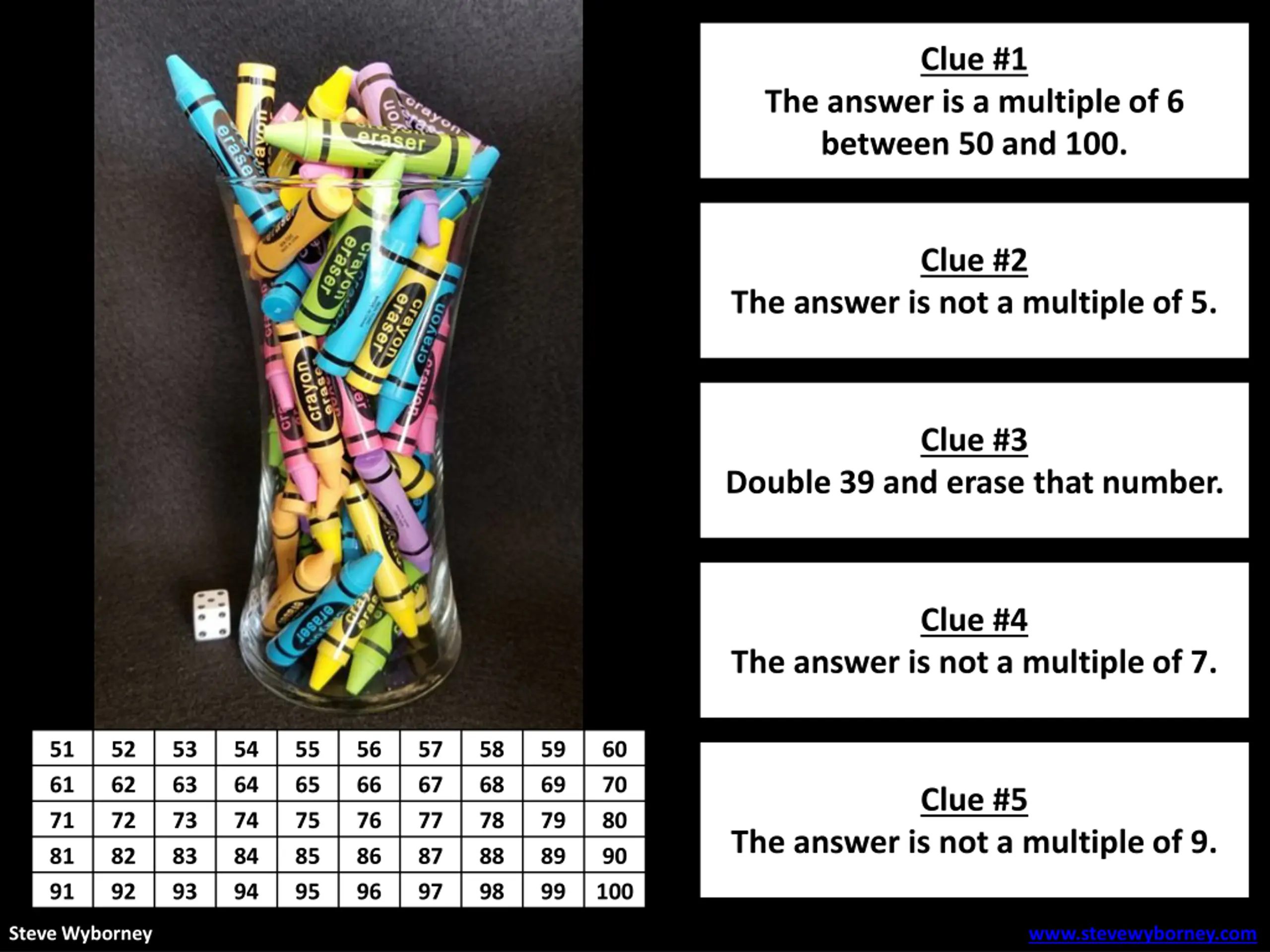 Clue #1 Clue #1 The answer is a multiple of 6 between 50 and 100. Clue #2 Clue #2 The answer is not a multiple of 5. Clue #3 Clue #3 Double 39 and erase that number. Clue #4 Clue #4 The answer is not a multiple of 7. Clue #5 Clue #5 The answer is not a multiple of 9. Steve Wyborney www.stevewyborney.com