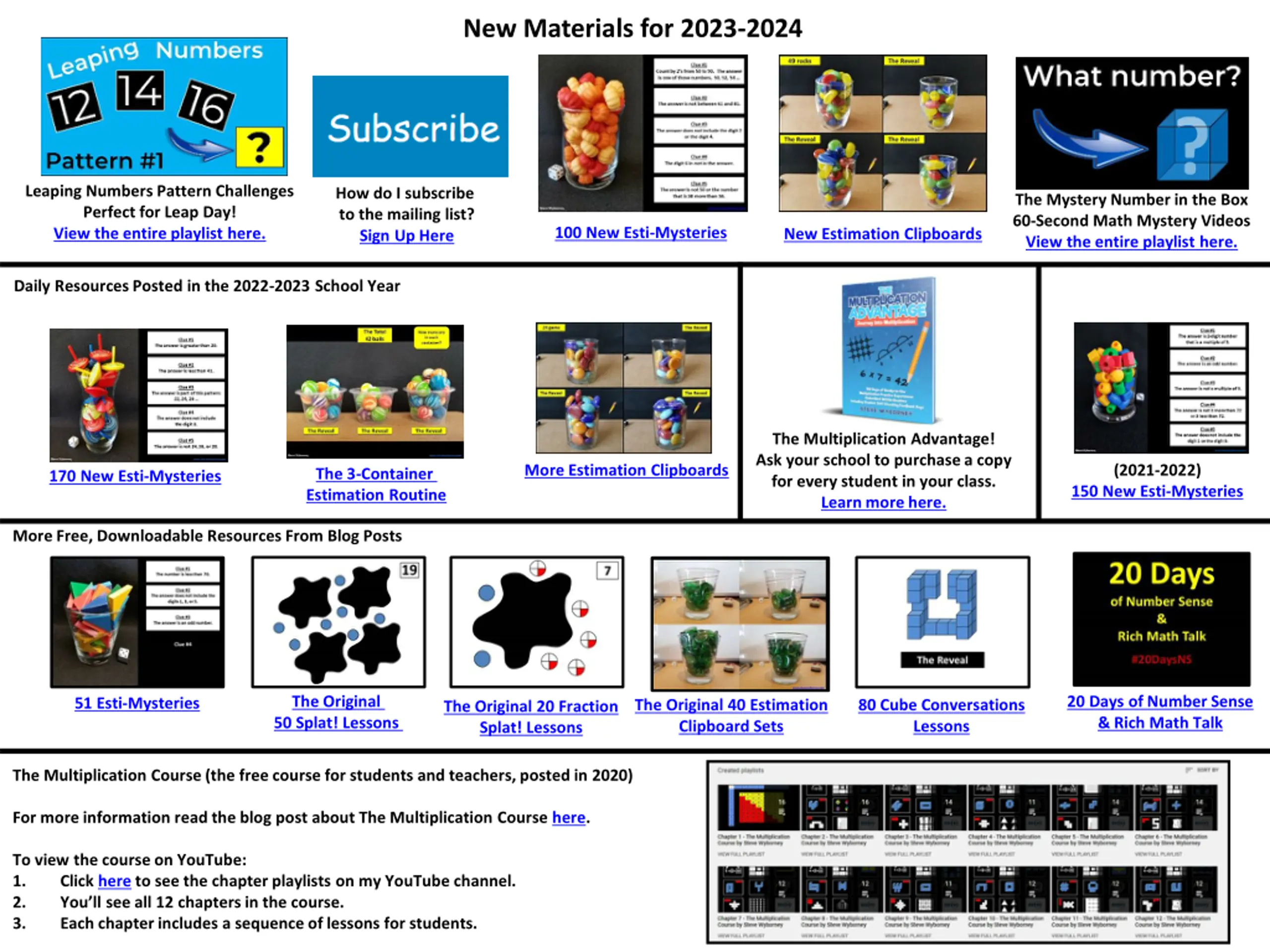 New Materials for 2023-2024 Leaping Numbers Pattern Challenges Perfect for Leap Day! View the entire playlist here. How do I subscribe to the mailing list? Sign Up Here The Mystery Number in the Box 60-Second Math Mystery Videos View the entire playlist here. 100 New Esti-Mysteries New Estimation Clipboards Daily Resources Posted in the 2022-2023 School Year The Multiplication Advantage! Ask your school to purchase a copy for every student in your class. Learn more here. More Estimation Clipboards (2021-2022) 150 New Esti-Mysteries The 3-Container Estimation Routine 170 New Esti-Mysteries More Free, Downloadable Resources From Blog Posts The Original 50 Splat! Lessons 20 Days of Number Sense & Rich Math Talk 51 Esti-Mysteries The Original 40 Estimation Clipboard Sets 80 Cube Conversations Lessons The Original 20 Fraction Splat! Lessons The Multiplication Course (the free course for students and teachers, posted in 2020) For more information read the blog post about The Multiplication Course here. To view the course on YouTube: 1. Click here to see the chapter playlists on my YouTube channel. 2. You’ll see all 12 chapters in the course. 3. Each chapter includes a sequence of lessons for students.