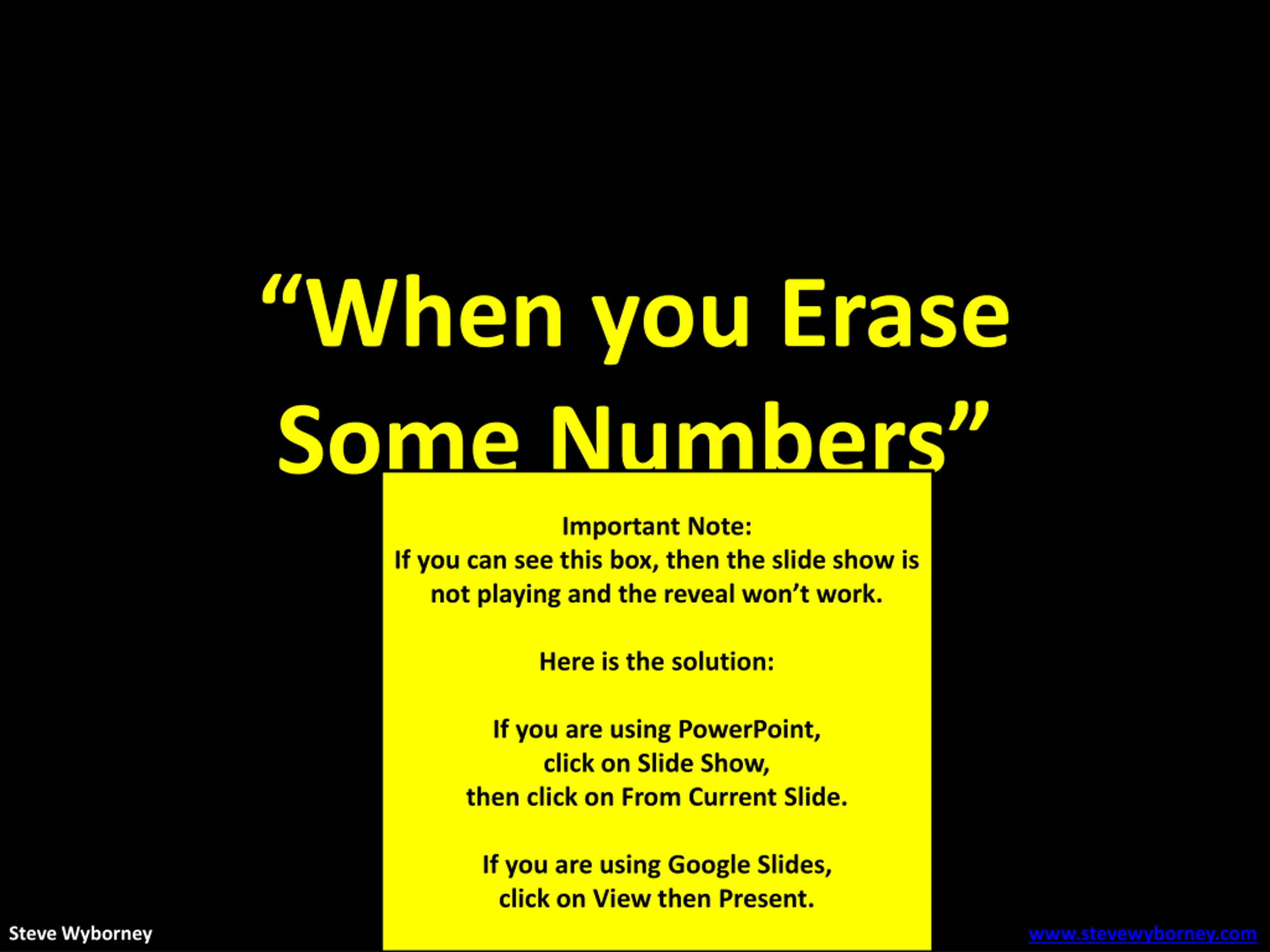 “When you Erase Some Numbers” Important Note: If you can see this box, then the slide show is not playing and the reveal won’t work. Here is the solution: If you are using PowerPoint, click on Slide Show, then click on From Current Slide. If you are using Google Slides, click on View then Present. Steve Wyborney www.stevewyborney.com