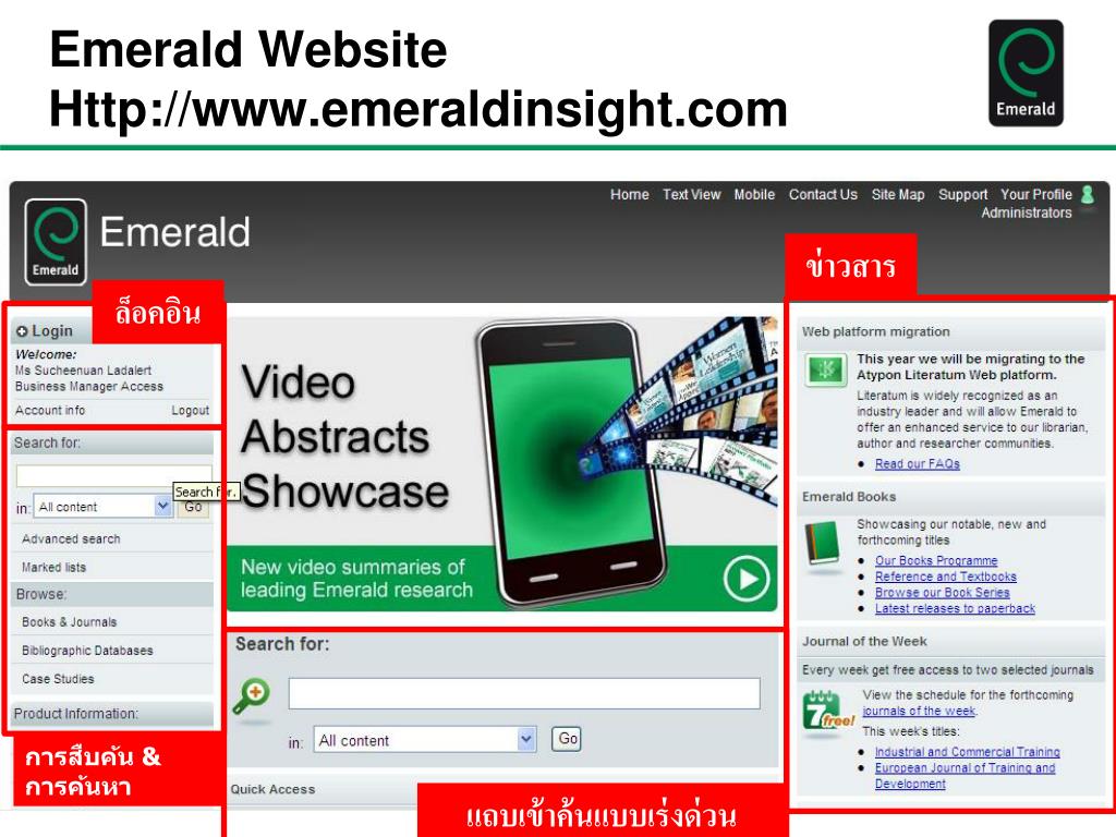 Emerald WebsiteHttp://www.emeraldinsight.com ข่าวสาร ล็อคอิน การสืบค้น & การค้นหา แถบเข้าค้นแบบเร่งด่วน