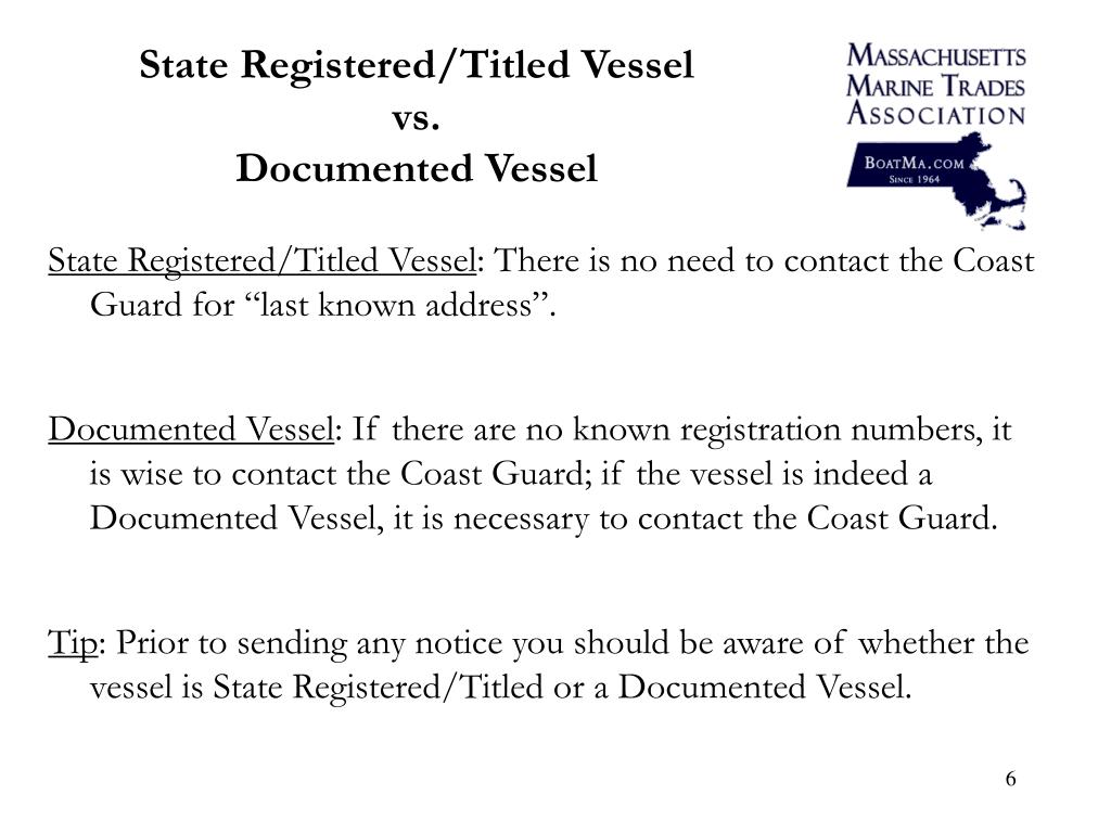 State Registered/Titled Vessel vs. Documented Vessel State Registered/Titled Vessel: There is no need to contact the Coast Guard for “last known address”. Documented Vessel: If there are no known registration numbers, it is wise to contact the Coast Guard; if the vessel is indeed a Documented Vessel, it is necessary to contact the Coast Guard. Tip: Prior to sending any notice you should be aware of whether the vessel is State Registered/Titled or a Documented Vessel.