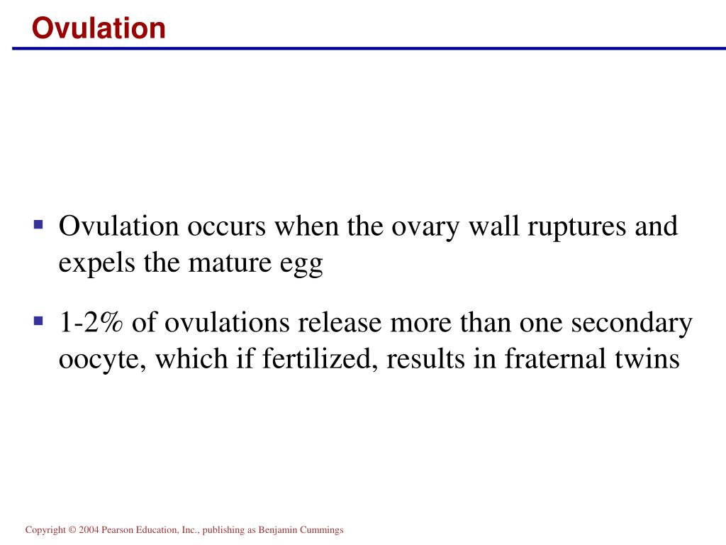 Ovulation • Ovulation occurs when the ovary wall ruptures and expels the mature egg • 1-2% of ovulations release more than one secondary oocyte, which if fertilized, results in fraternal twins