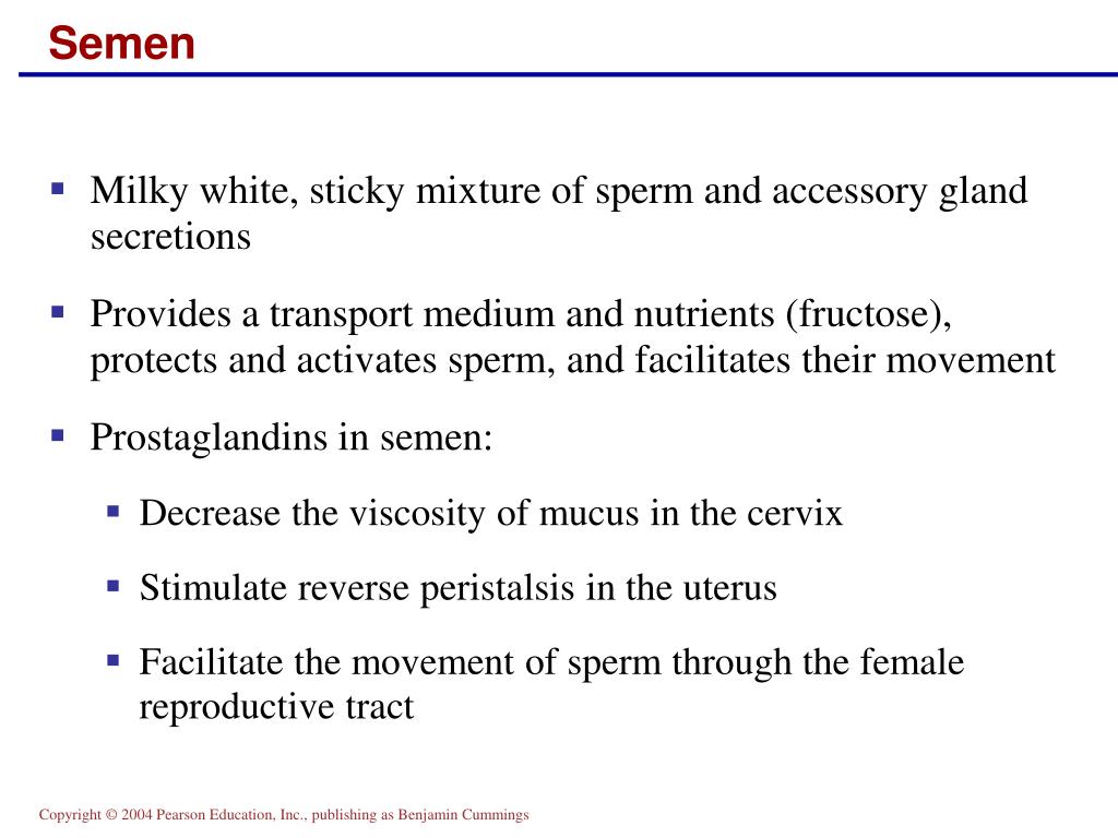 Semen • Milky white, sticky mixture of sperm and accessory gland secretions • Provides a transport medium and nutrients (fructose), protects and activates sperm, and facilitates their movement • Prostaglandins in semen: • Decrease the viscosity of mucus in the cervix • Stimulate reverse peristalsis in the uterus • Facilitate the movement of sperm through the female reproductive tract