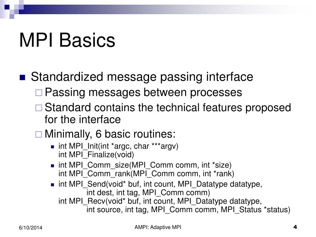 MPI Basics • MPI-2 Standard contains: • Further corrections and clarifications for the MPI-1 document • Completely new types of functionality • Dynamic processes • One-sided communication • Parallel I/O • Added bindings for Fortran 90 and C++ • Lots of new functions: 188 for C binding AMPI: Adaptive MPI