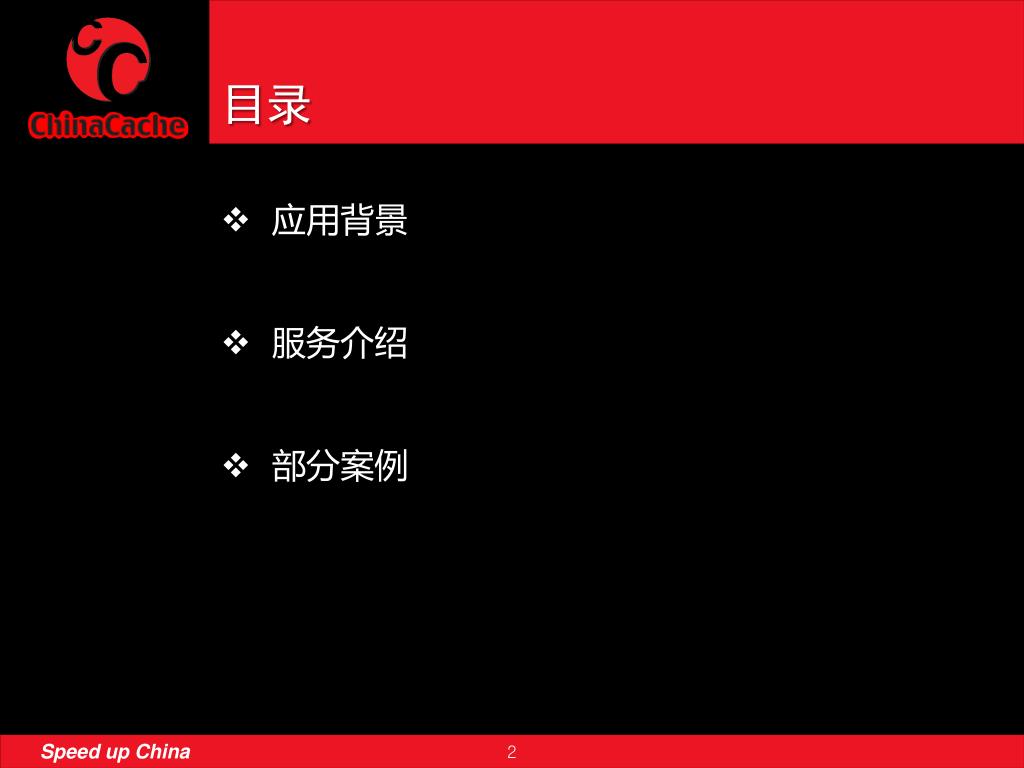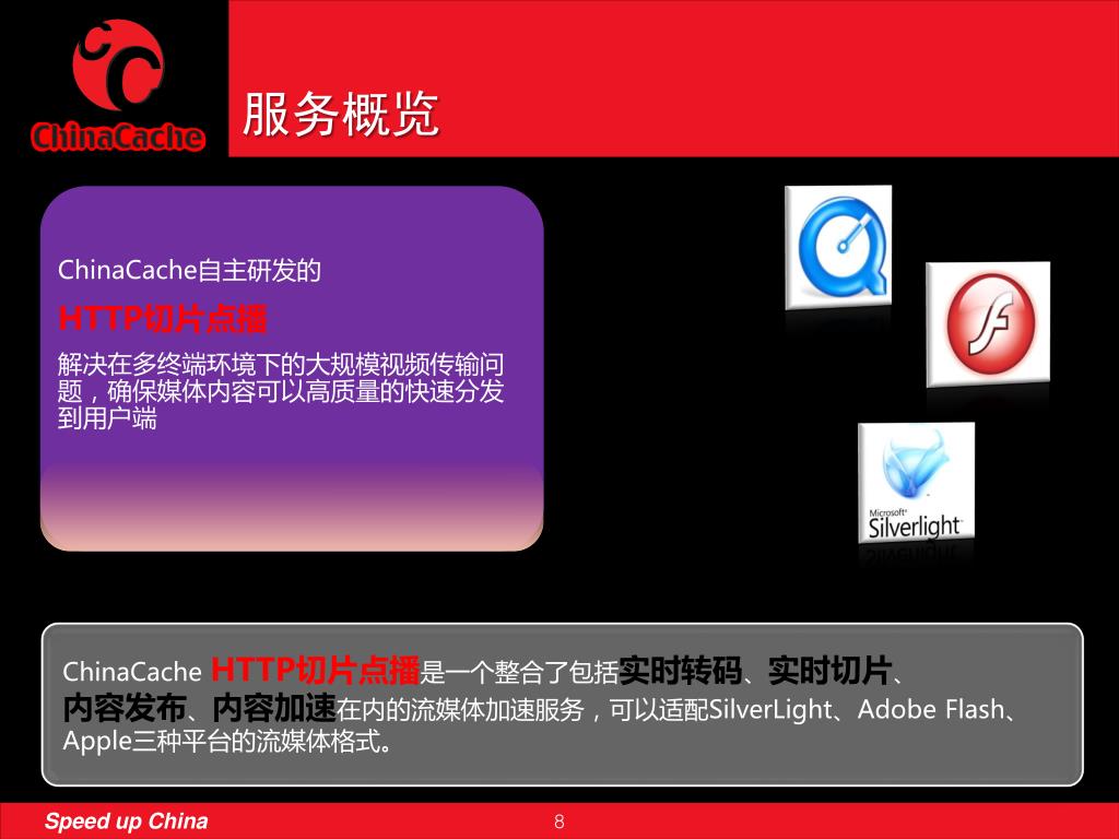 服务概览 ChinaCache自主研发的 HTTP切片点播 解决在多终端环境下的大规模视频传输问题,确保媒体内容可以高质量的快速分发到用户端 ChinaCacheHTTP切片点播是一个整合了包括实时转码、实时切片、 内容发布、内容加速在内的流媒体加速服务,可以适配SilverLight、Adobe Flash、Apple三种平台的流媒体格式。