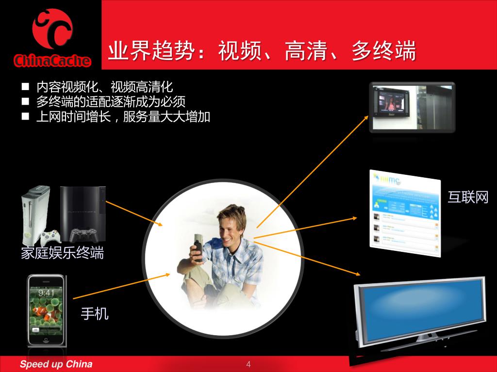 业界趋势:视频、高清、多终端 • 内容视频化、视频高清化 • 多终端的适配逐渐成为必须 • 上网时间增长,服务量大大增加 互联网 家庭娱乐终端 手机 TV