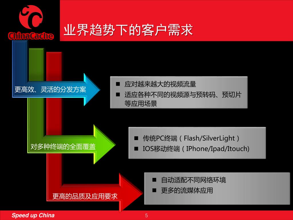 业界趋势下的客户需求 • 自动适配不同网络环境 • 更多的流媒体应用 • 应对越来越大的视频流量 • 适应各种不同的视频源与预转码、预切片等应用场景 • 传统PC终端(Flash/SilverLight) • IOS移动终端(IPhone/Ipad/Itouch) 更高效、灵活的分发方案 对多种终端的全面覆盖 更高的品质及应用要求