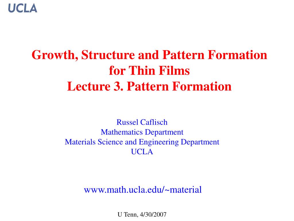 Growth, Structure and Pattern Formation for Thin FilmsLecture 3. Pattern Formation Russel Caflisch Mathematics Department Materials Science and Engineering Department UCLA www.math.ucla.edu/~material U Tenn, 4/30/2007