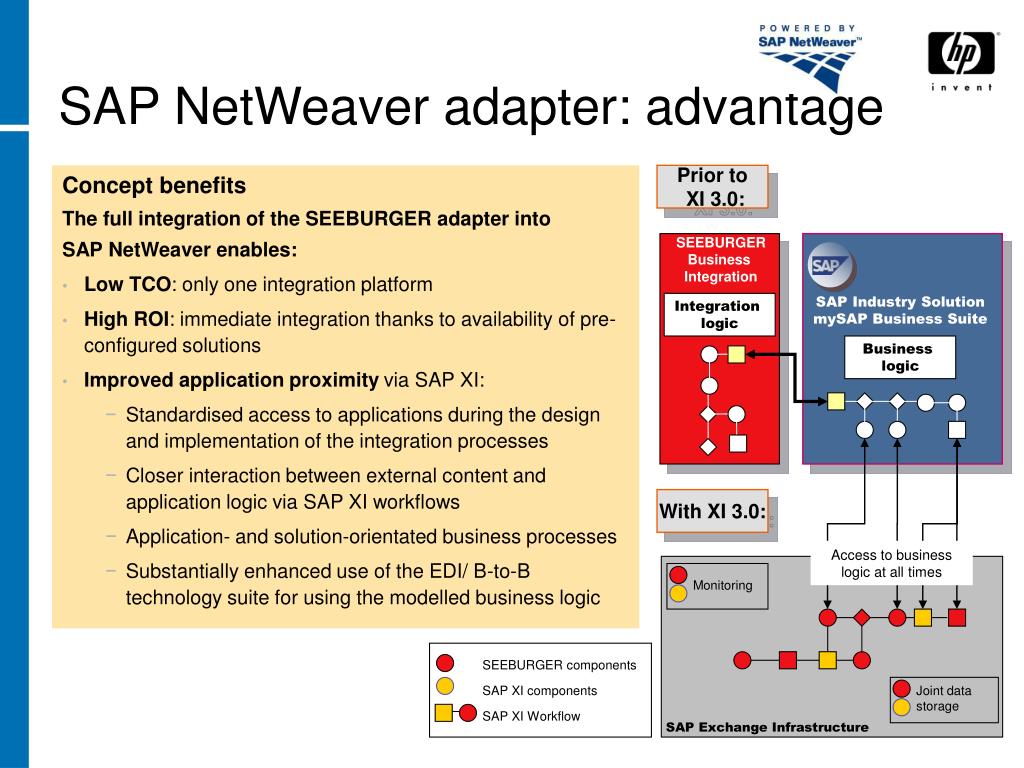 NetWeaver Adapter by SEEBURGER SAP NetWeaver adapter by SEEBURGER: • The SEEBURGER adapter runs on the SAP Web AS (J2EE Engine) • The SEEBURGER adapter is integrated into the SAP Exchange Infrastructure via JCA (Java Connector Architecture) • Consequences: • Availability of the entire SEEBURGER EDI/B-to-B technology suite within SAP NetWeaver • Central storage of business content (mappings, master data, SAP XI workflows) in the SAP XI system landscape directory (integration repository etc.) • Central configuration and design by deployment of XI tools • Central monitoring and alerting via SAP XI • Benefits: • Low TCO: only one integration platform • High ROI: immediate integration by provision of pre-configured solutions Exchange infrastructure Business partners (external) EDI Adapter JCA Internal component SAP NetWeaver™ People Integration Composite Application Framework Life Cycle Management Multi-Channel Access Portal Collaboration Information Integration BusinessIntelligence KnowledgeManagement Master Data Management Process Integration Business ProcessManagement Integration Broker Application Platform J2EE ABAP DB and OS Abstraction DB and OS Abstraction