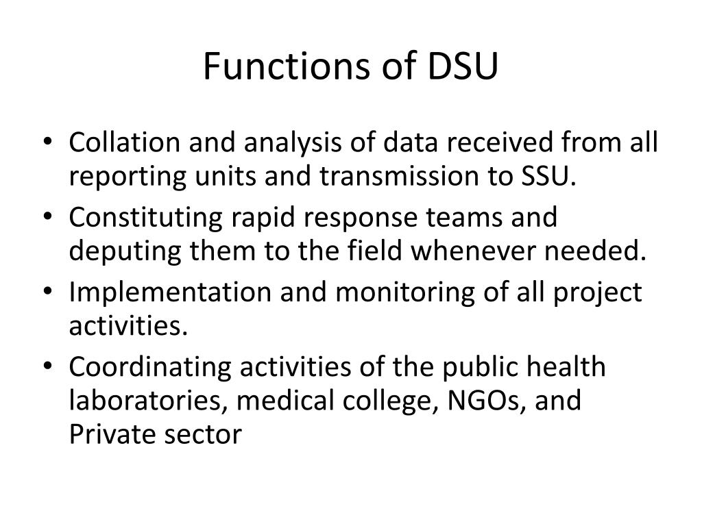 Functions of DSU • Collation and analysis of data received from all reporting units and transmission to SSU. • Constituting rapid response teams and deputing them to the field whenever needed. • Implementation and monitoring of all project activities. • Coordinating activities of the public health laboratories, medical college, NGOs, and Private sector