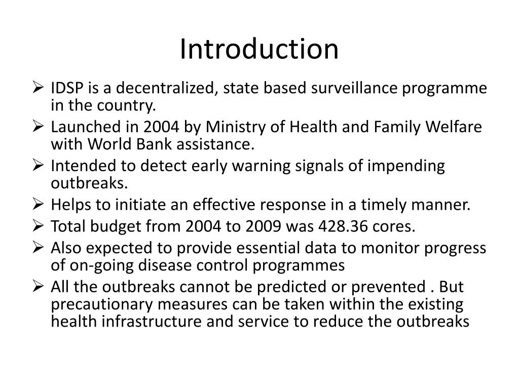 Introduction • IDSP is a decentralized, state based surveillance programme in the country. • Launched in 2004 by Ministry of Health and Family Welfare with World Bank assistance. • Intended to detect early warning signals of impending outbreaks. • Helps to initiate an effective response in a timely manner. • Total budget from 2004 to 2009 was 428.36 cores. • Also expected to provide essential data to monitor progress of on-going disease control programmes • All the outbreaks cannot be predicted or prevented . But precautionary measures can be taken within the existing health infrastructure and service to reduce the outbreaks