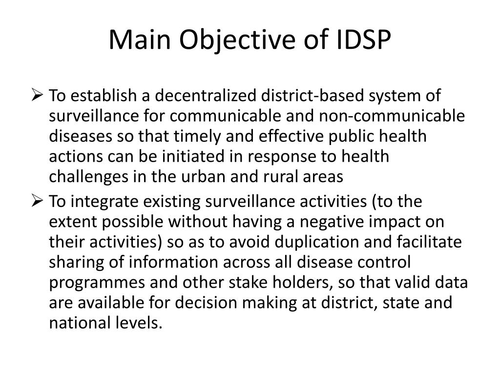 Main Objective of IDSP • To establish a decentralized district-based system of surveillance for communicable and non-communicable diseases so that timely and effective public health actions can be initiated in response to health challenges in the urban and rural areas • To integrate existing surveillance activities (to the extent possible without having a negative impact on their activities) so as to avoid duplication and facilitate sharing of information across all disease control programmes and other stake holders, so that valid data are available for decision making at district, state and national levels.
