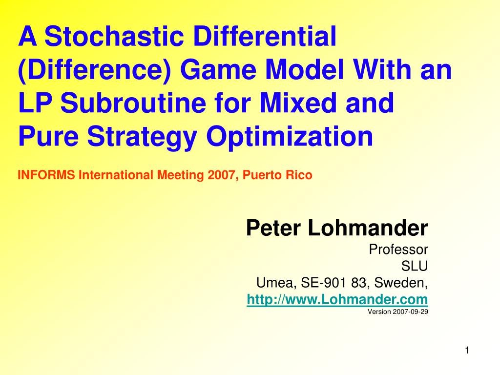 A Stochastic Differential (Difference) Game Model With an LP Subroutine for Mixed and Pure Strategy OptimizationINFORMS International Meeting 2007, Puerto Rico Peter Lohmander Professor SLU Umea, SE-901 83, Sweden, http://www.Lohmander.com Version 2007-09-29