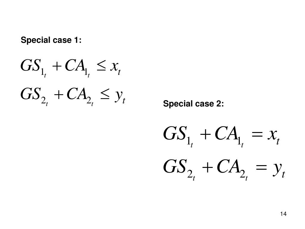 ! Day n >= 3, you may use some resources for GS and some for CA. The rows and columns represent the resources used for GS. ; @for(xyD1set(x,y,D1)|D1 #LE# x: GS1(x,y,D1) = D1-1 ); @for(xyD1set(x,y,D1)|D1 #GT# x: GS1(x,y,D1) = 0 ); @for(xyD1set(x,y,D1): CA1(x,y,D1) = x - 1 - GS1(x,y,D1) ); @for(xyD2set(x,y,D2)|D2 #LE# y: GS2(x,y,D2) = D2-1 ); @for(xyD2set(x,y,D2)|D2 #GT# y: GS2(x,y,D2) = 0 ); @for(xyD2set(x,y,D2): CA2(x,y,D2) = y - 1 - GS2(x,y,D2));