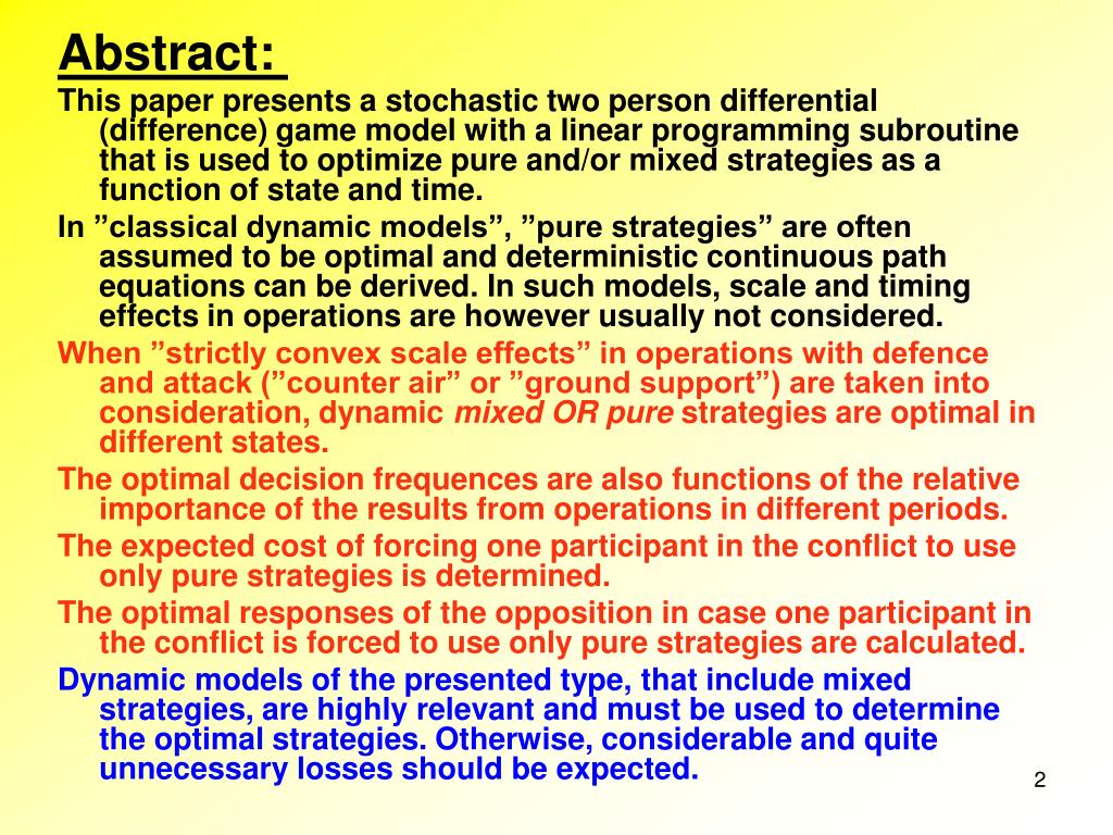Abstract: This paper presents a stochastic two person differential (difference) game model with a linear programming subroutine that is used to optimize pure and/or mixed strategies as a function of state and time. In ”classical dynamic models”, ”pure strategies” are often assumed to be optimal and deterministic continuous path equations can be derived. In such models, scale and timing effects in operations are however usually not considered. When ”strictly convex scale effects” in operations with defence and attack (”counter air” or ”ground support”) are taken into consideration, dynamic mixed OR pure strategies are optimal in different states. The optimal decision frequences are also functions of the relative importance of the results from operations in different periods. The expected cost of forcing one participant in the conflict to use only pure strategies is determined. The optimal responses of the opposition in case one participant in the conflict is forced to use only pure strategies are calculated. Dynamic models of the presented type, that include mixed strategies, are highly relevant and must be used to determine the optimal strategies. Otherwise, considerable and quite unnecessary losses should be expected.