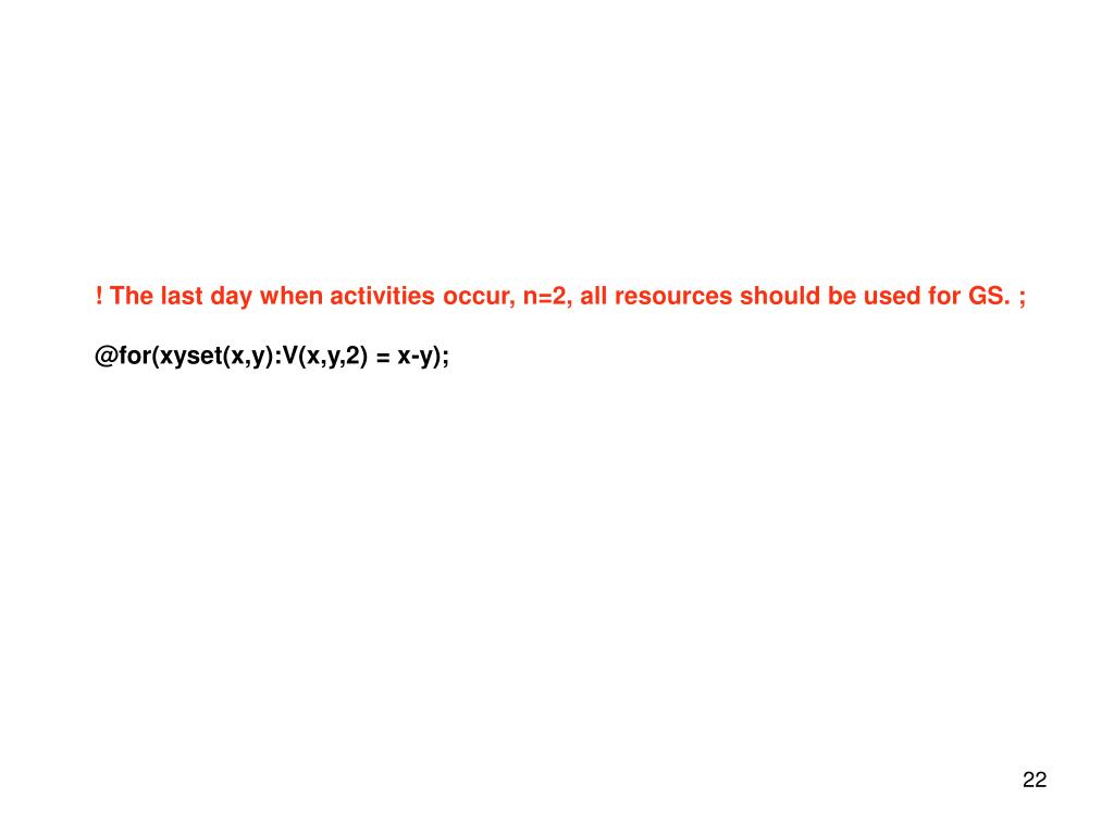 ! The last day when activities occur, n=2, all resources should be used for GS. ; @for(xyset(x,y):V(x,y,2) = x-y);