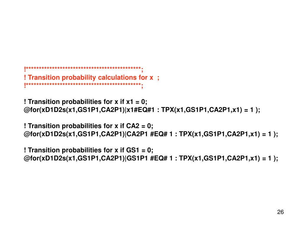 !********************************************; ! Transition probability calculations for x ; !********************************************; ! Transition probabilities for x if x1 = 0; @for(xD1D2s(x1,GS1P1,CA2P1)|x1#EQ#1 : TPX(x1,GS1P1,CA2P1,x1) = 1 ); ! Transition probabilities for x if CA2 = 0; @for(xD1D2s(x1,GS1P1,CA2P1)|CA2P1 #EQ# 1 : TPX(x1,GS1P1,CA2P1,x1) = 1 ); ! Transition probabilities for x if GS1 = 0; @for(xD1D2s(x1,GS1P1,CA2P1)|GS1P1 #EQ# 1 : TPX(x1,GS1P1,CA2P1,x1) = 1 );