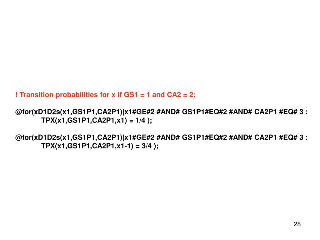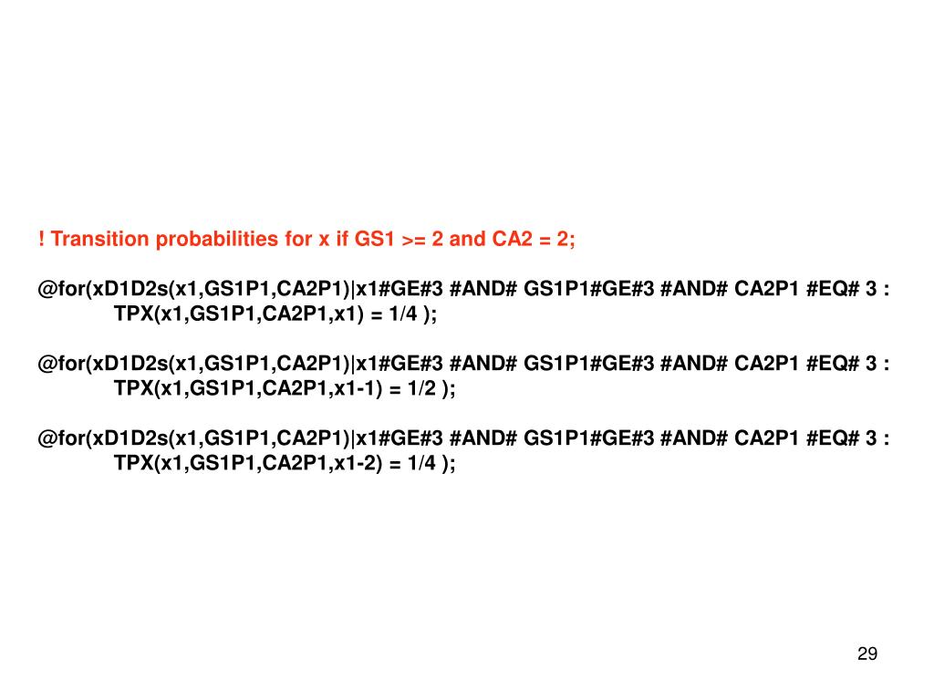 ! Transition probabilities for x if GS1 = 1 and CA2 = 2; @for(xD1D2s(x1,GS1P1,CA2P1)|x1#GE#2 #AND# GS1P1#EQ#2 #AND# CA2P1 #EQ# 3 : TPX(x1,GS1P1,CA2P1,x1) = 1/4 ); @for(xD1D2s(x1,GS1P1,CA2P1)|x1#GE#2 #AND# GS1P1#EQ#2 #AND# CA2P1 #EQ# 3 : TPX(x1,GS1P1,CA2P1,x1-1) = 3/4 );
