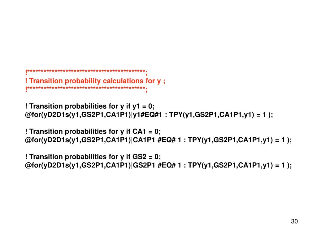 !Sum (Transition probability) = 1; @for(xD1D2s(x1,GS1,CA2): @sum(xset(x2): TPX(x1,GS1,CA2,x2) ) = 1 ); @for(yD2D1s(y1,GS2,CA1): @sum(yset(y2): TPY(y1,GS2,CA1,y2) ) = 1 );