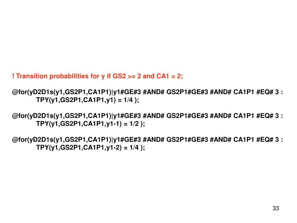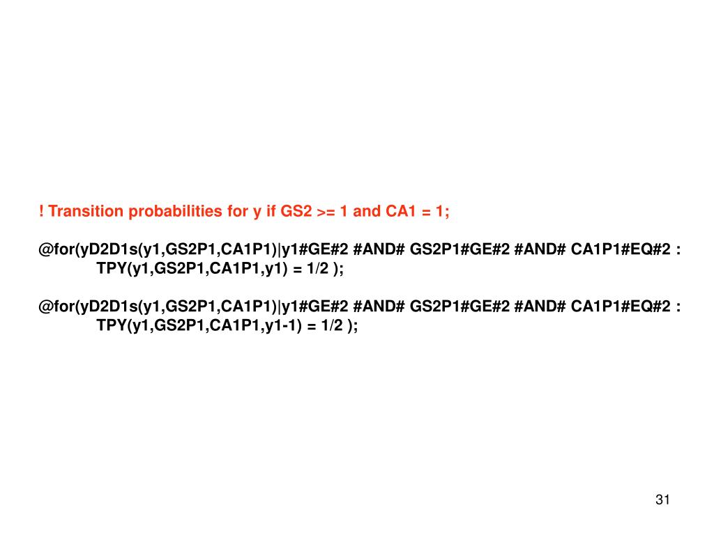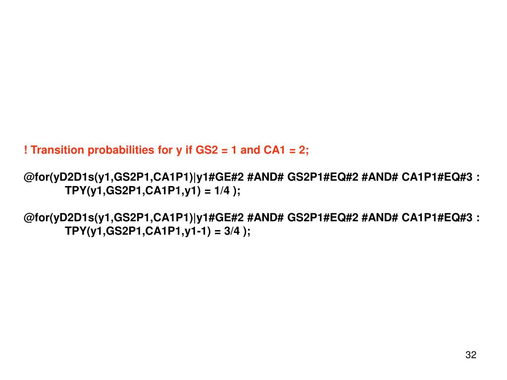 ! Transition probabilities for y if GS2 = 1 and CA1 = 2; @for(yD2D1s(y1,GS2P1,CA1P1)|y1#GE#2 #AND# GS2P1#EQ#2 #AND# CA1P1#EQ#3 : TPY(y1,GS2P1,CA1P1,y1) = 1/4 ); @for(yD2D1s(y1,GS2P1,CA1P1)|y1#GE#2 #AND# GS2P1#EQ#2 #AND# CA1P1#EQ#3 : TPY(y1,GS2P1,CA1P1,y1-1) = 3/4 );
