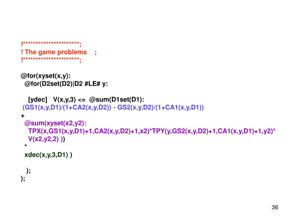 !**********************; ! The game problems ; !**********************; @for(xyset(x,y): @for(D2set(D2)|D2 #LE# y: [ydec] V(x,y,3) <= @sum(D1set(D1): (GS1(x,y,D1)/(1+CA2(x,y,D2)) - GS2(x,y,D2)/(1+CA1(x,y,D1)) + @sum(xyset(x2,y2): TPX(x,GS1(x,y,D1)+1,CA2(x,y,D2)+1,x2)*TPY(y,GS2(x,y,D2)+1,CA1(x,y,D1)+1,y2)* V(x2,y2,2) )) * xdec(x,y,3,D1) ) ); );