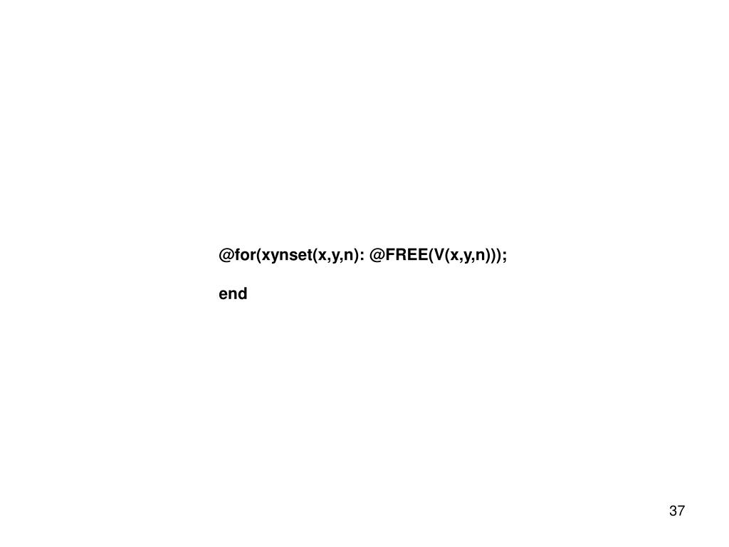@for(xynset(x,y,n): @sum(D1set(D1):xdec(x,y,n,D1)) = 1); @for(xynD1s(x,y,n,D1)| D1#GT#x: xdec(x,y,n,D1) = 0);