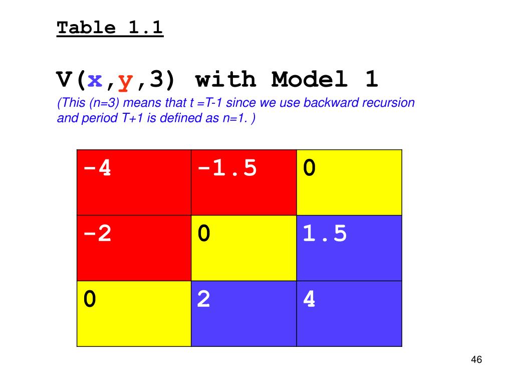 Table 1.1 V(x,y,3) with Model 1 (This (n=3) means that t =T-1 since we use backward recursion and period T+1 is defined as n=1. )