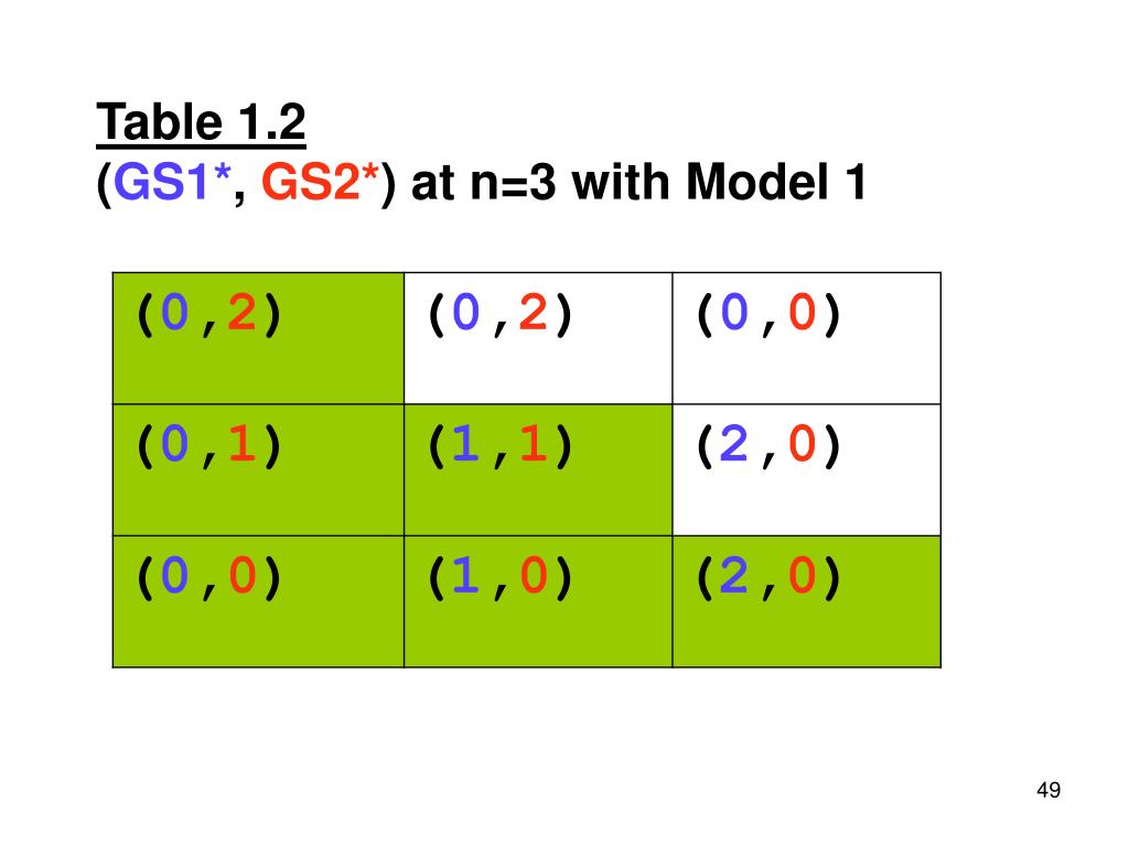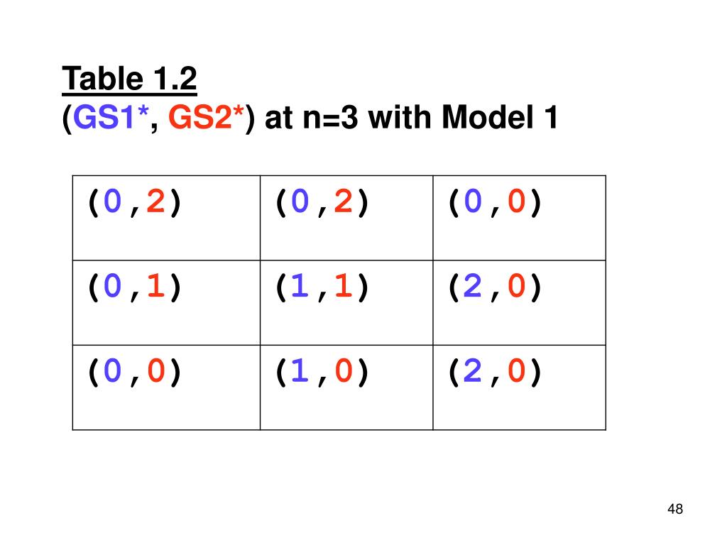 Table 1.2 (GS1*, GS2*)at n=3 with Model 1