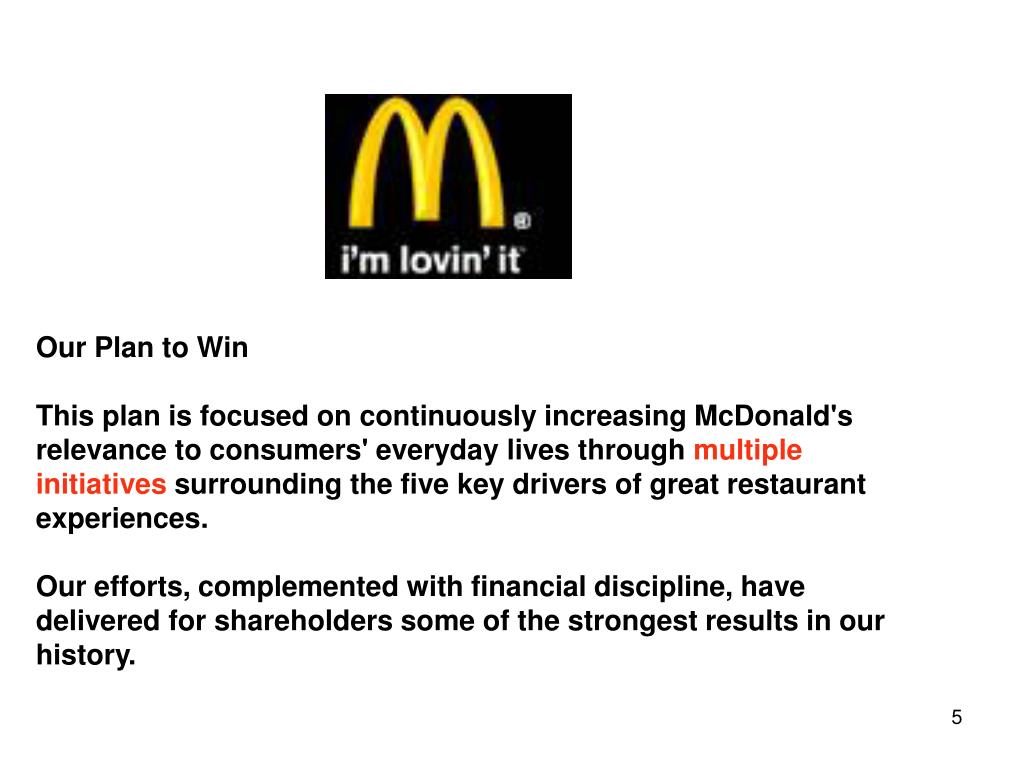 Our Plan to WinThis plan is focused on continuously increasing McDonald's relevance to consumers' everyday lives through multiple initiatives surrounding the five key drivers of great restaurant experiences.Our efforts, complemented with financial discipline, have delivered for shareholders some of the strongest results in our history.