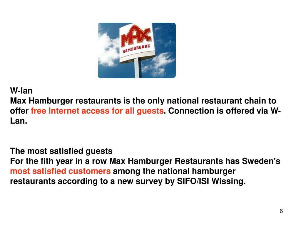 W-lan Max Hamburger restaurants is the only national restaurant chain to offer free Internet access for all guests. Connection is offered via W-Lan. The most satisfied guests For the fith year in a row Max Hamburger Restaurants has Sweden's most satisfied customers among the national hamburger restaurants according to a new survey by SIFO/ISI Wissing.