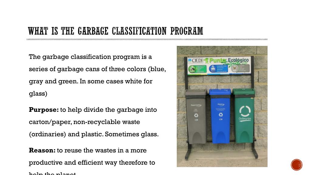 What is the garbage classification program The garbage classification program is a series of garbage cans of three colors (blue, gray and green. In some cases white for glass) Purpose: to help divide the garbage into carton/paper, non-recyclable waste (ordinaries) and plastic. Sometimes glass. Reason: to reuse the wastes in a more productive and efficient way therefore to help the planet.