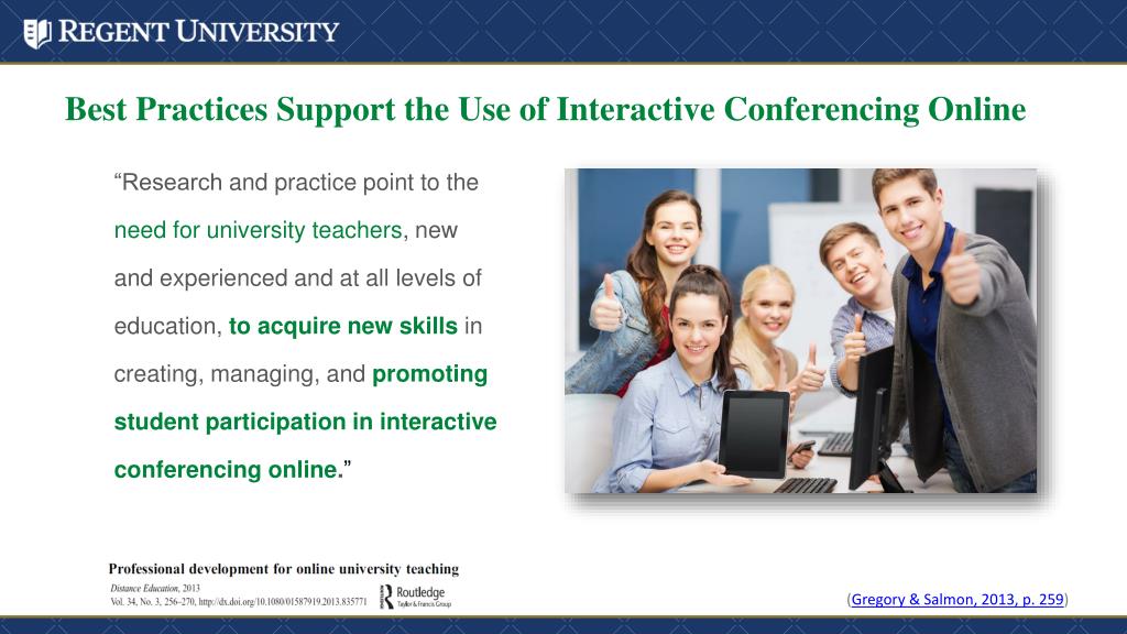 Best Practices Support the Use of Interactive Conferencing Online (Gregory & Salmon, 2013, p. 259) “Research and practice point to the need for university teachers, new and experienced and at all levels of education, to acquire new skills in creating, managing, and promotingstudent participation in interactive conferencing online.”