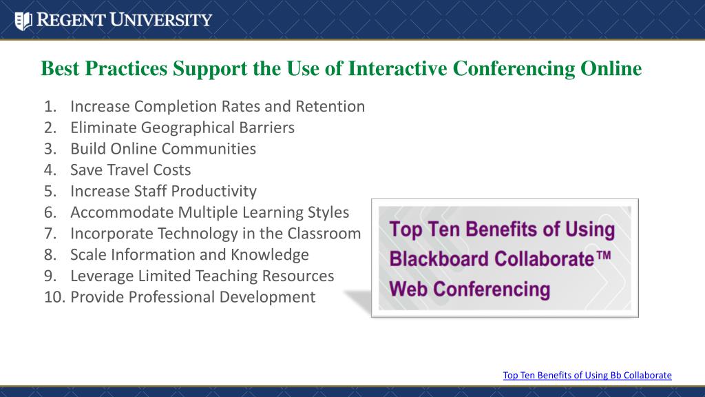 Best Practices Support the Use of Interactive Conferencing Online Top Ten Benefits of Using Bb Collaborate Increase Completion Rates and Retention Eliminate Geographical Barriers Build Online Communities Save Travel Costs Increase Staff Productivity Accommodate Multiple Learning Styles Incorporate Technology in the Classroom Scale Information and Knowledge Leverage Limited Teaching Resources Provide Professional Development