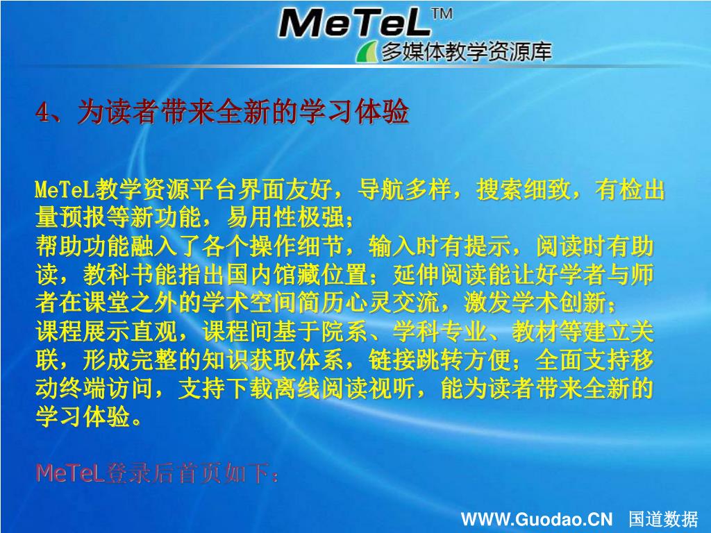 4、为读者带来全新的学习体验MeTeL教学资源平台界面友好,导航多样,搜索细致,有检出量预报等新功能,易用性极强;帮助功能融入了各个操作细节,输入时有提示,阅读时有助读,教科书能指出国内馆藏位置;延伸阅读能让好学者与师者在课堂之外的学术空间简历心灵交流,激发学术创新;课程展示直观,课程间基于院系、学科专业、教材等建立关联,形成完整的知识获取体系,链接跳转方便;全面支持移动终端访问,支持下载离线阅读视听,能为读者带来全新的学习体验。MeTeL登录后首页如下:4、为读者带来全新的学习体验MeTeL教学资源平台界面友好,导航多样,搜索细致,有检出量预报等新功能,易用性极强;帮助功能融入了各个操作细节,输入时有提示,阅读时有助读,教科书能指出国内馆藏位置;延伸阅读能让好学者与师者在课堂之外的学术空间简历心灵交流,激发学术创新;课程展示直观,课程间基于院系、学科专业、教材等建立关联,形成完整的知识获取体系,链接跳转方便;全面支持移动终端访问,支持下载离线阅读视听,能为读者带来全新的学习体验。MeTeL登录后首页如下: