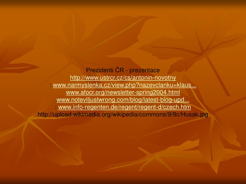 Prezidenti ČR - prezentace http://www.ustrcr.cz/cs/antonin-novotny : www.narmyslenka.cz/view.php?nazevclanku=klaus... www.afocr.org/newsletter-spring2004.html www.noteviljustwrong.com/blog/latest-blog-upd... : www.info-regenten.de/regent/regent-d/czech.htm http://upload.wikimedia.org/wikipedia/commons/9/9c/Husak.jpg