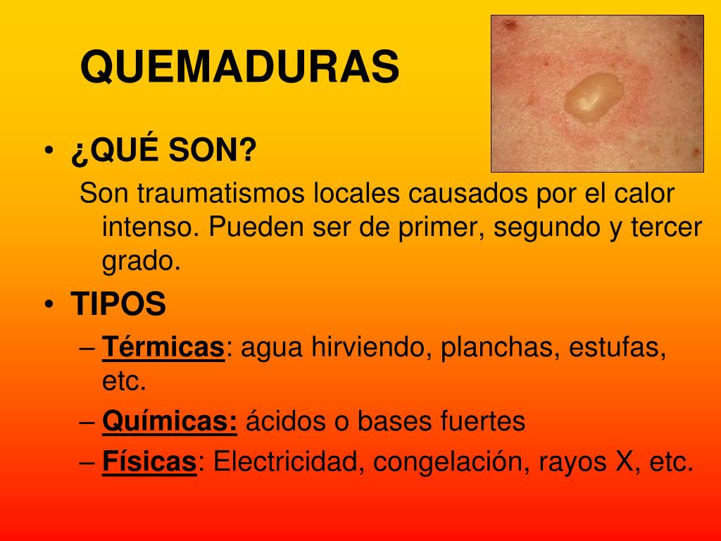 QUEMADURAS • ¿QUÉ SON? Son traumatismos locales causados por el calor intenso. Pueden ser de primer, segundo y tercer grado. • TIPOS • Térmicas: agua hirviendo, planchas, estufas, etc. • Químicas: ácidos o bases fuertes • Físicas: Electricidad, congelación, rayos X, etc.