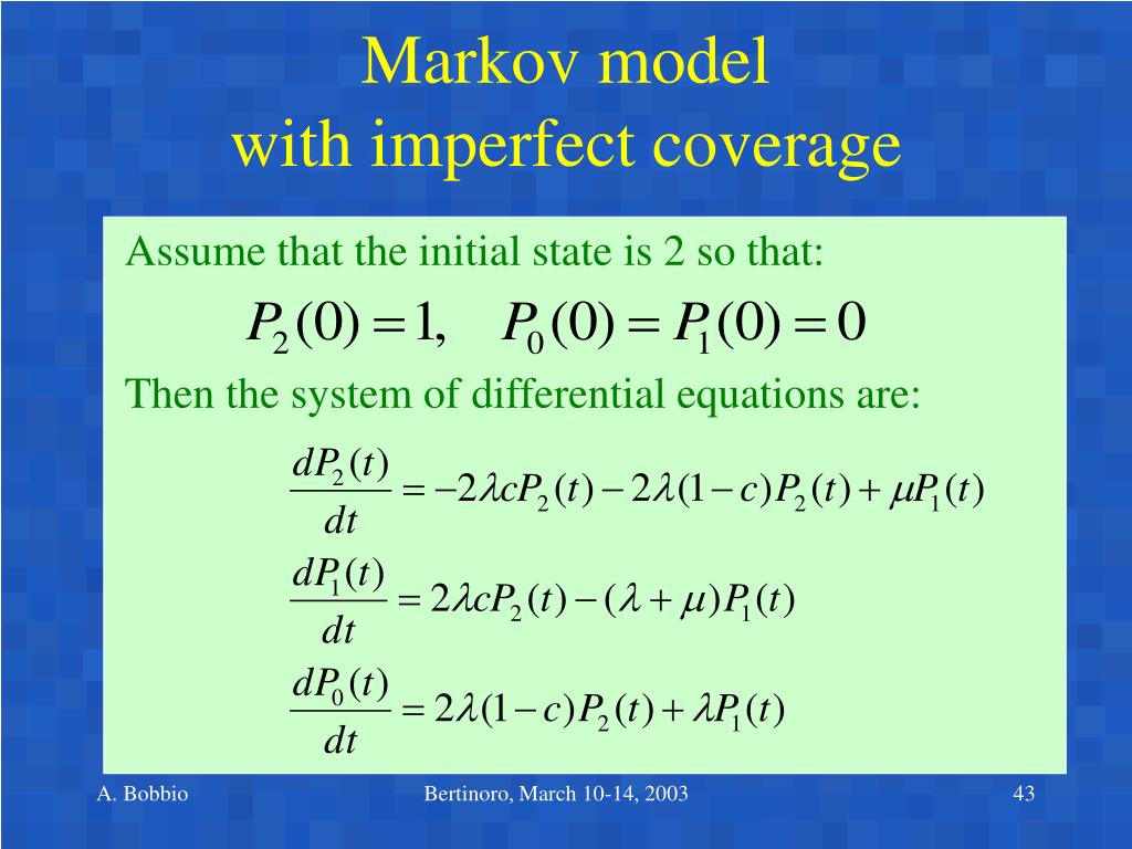 Assume that the initial state is 2 so that: Then the system of differential equations are: Markov modelwith imperfect coverage Bertinoro, March 10-14, 2003