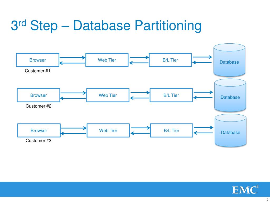 3rd Step – Database Partitioning Database Web Tier B/L Tier Browser • Customer #1 Database Web Tier B/L Tier Browser • Customer #2 Database Web Tier B/L Tier Browser • Customer #3